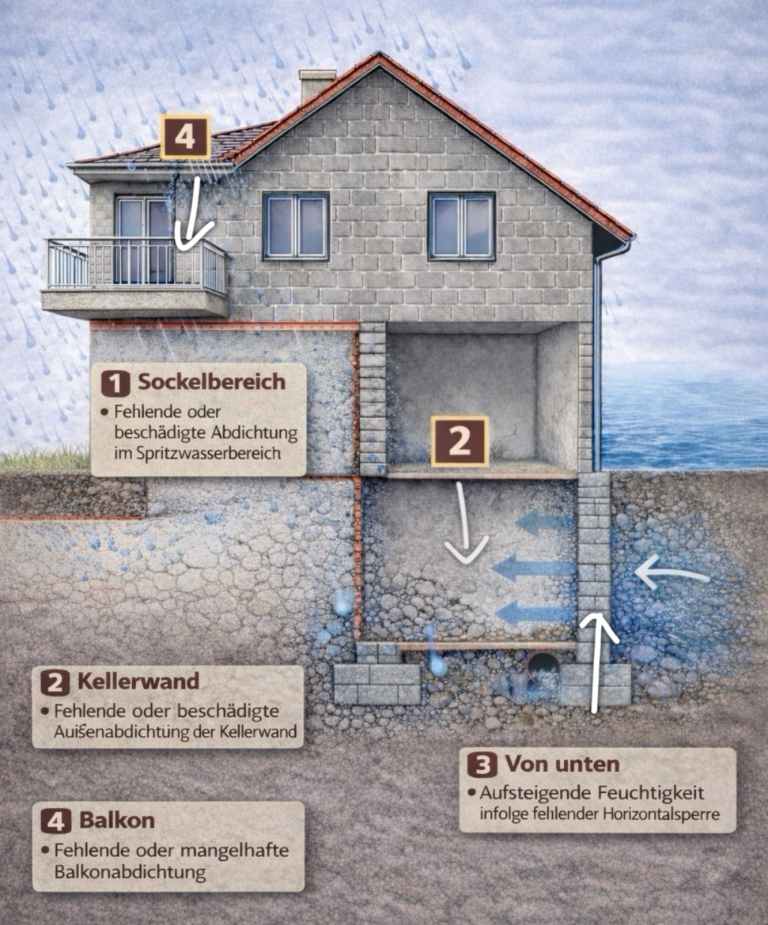 Bei vielen Häusern fehlt zudem eine wirksame Horizontalsperre, wodurch Feuchtigkeit aus dem Erdreich in das Mauerwerk aufsteigen kann. Seitlich eindringendes Wasser, feuchte Kellerwände oder undichte Balkone führen langfristig zu Schäden wie abgeplatzter Putz, Schimmelbildung oder einer Beeinträchtigung der Bausubstanz. Eine fachgerechte Abdichtung ist daher entscheidend, um den Wert und die Nutzung des Gebäudes dauerhaft zu sichern.